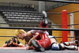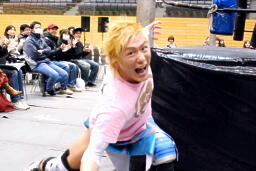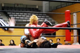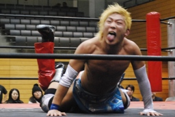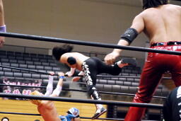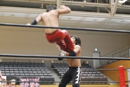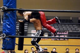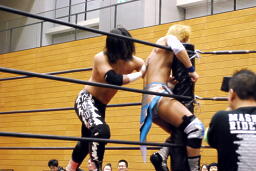 高尾コーナーに上ってミサイルキック(右写真)、カウント2。