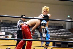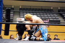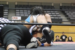大石ミラクルエクスタシー、高尾は飛びヒザ蹴りでブロック。高尾ロープに飛ぶ、大石キャッチしてミラクルエクスタシー(左写真)、押さえ込む、