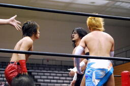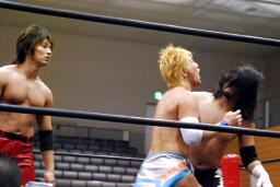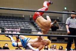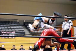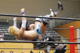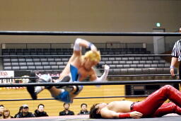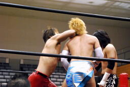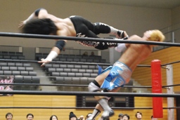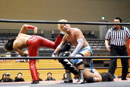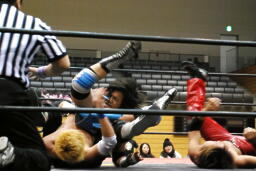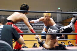大石2人にクロスボディ(右写真)、2人キャッチ。しかし大石は2人を手玉に取り、高尾の足を払って佐々木にドロップキックの形でぶつける。