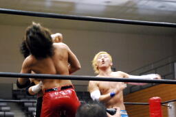 大石ローリングエルボー(左写真)、佐々木が背後から投げっ放しジャーマン。