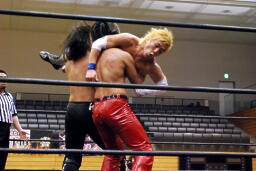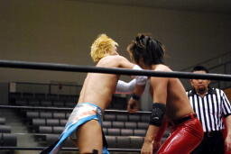 佐々木Now or Never狙うが高尾は首固めに(右写真)、カウント2。