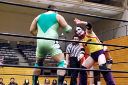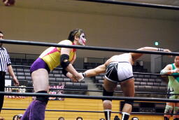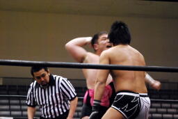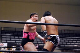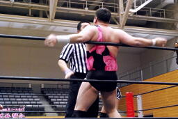 アントンリングインするが平田が松井レフェリーを引きつけて見せないようにしていたため認められない(左写真)。入江は平田にタッチ。