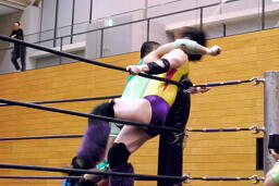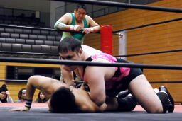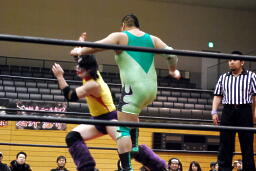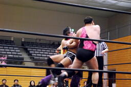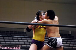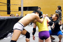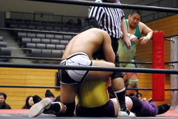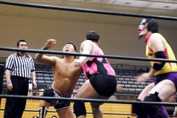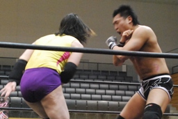 入江エルボー(右写真)、ネックロック、矢野コーナーに押し込んでタッチ。