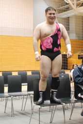 入江がキック、矢野逃げる(左写真)。矢野そのまま客席に出、イスに上って「ハス!ハス!」