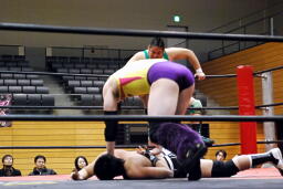 入江矢野の腹に乗る(左写真)。ボディスラムからエルボー。