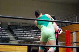 平田リングに戻るとスリーパー(右写真)、リリースするとカバー、カウント2。入江にタッチ。