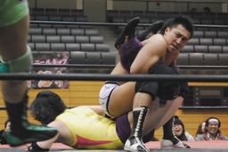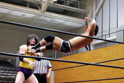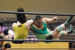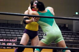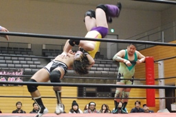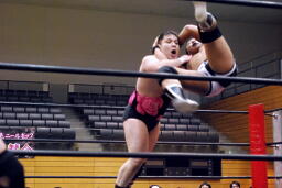 逆エビ固め(右写真)から逆片エビ、矢野ロープ。