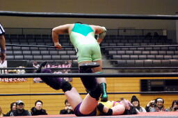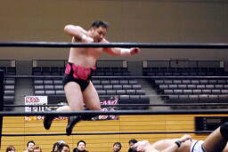平田が突っ込む、アントンキャッチしてボディスラム、コーナーに上ってダイビングフィストドロップ(左写真)、カウント3。