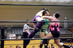 そしてブラックホールスラム(右写真)、カバーに行くが松井レフェリーは「権利なし」としてノーカウント。平田がカバー、カウント2。もう一度カバー、カウント2。上に乗ってエビ固め、カウント2。