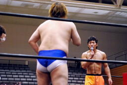 高梨「惜しい。ちょっと近いけどな。プロレス業界で一番上なのは興行を買ってくださるプロモーターさんなんだよ!そして吉田社長は今日の興行のプロモーターさんだ!ディーノがいて、ニラがいて、俺のパートナーは吉田社長だ。その意味を理解して試合するんだな。ニラ、今日はお前が得意としてきた接待プロレスだ。ディーノ、プロモーターさんにお前がゲイ殺法することは俺が許さん。全て俺にやれ。来年の茨城大会を実現させるためにも、ここで俺らが接待プロレスしなかったら成り立たないんだよ。そして吉田社長の必殺技はブレーンバスターだ。だからお前ら、豪快にブレーンをバーストさせろよ!」