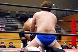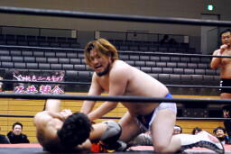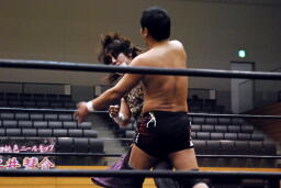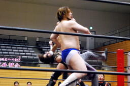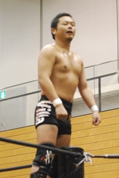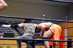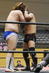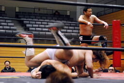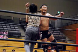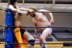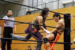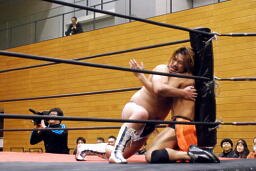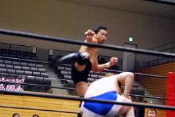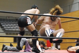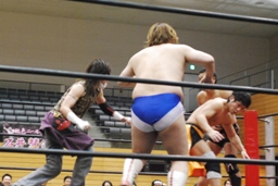吉田ローキック、ハイキック、ディーノかわすが(右写真)吉田もう一回転して旋風脚。ロープに飛んでヒザ蹴り、高梨にタッチ。