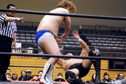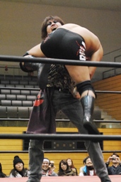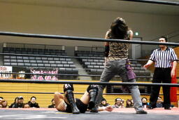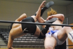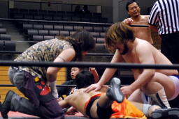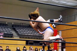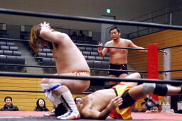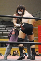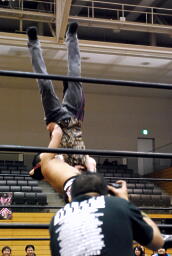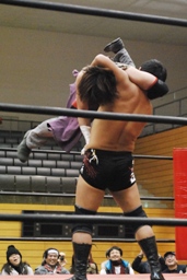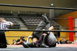 そして「必殺」のブレーンバスター(左写真)、しかしニラはカウント1で返す。驚く高梨。ニラは高梨にロケットパンチ。5分経過。
