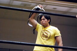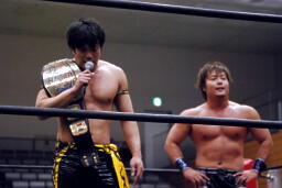 KUDOあいさつ「本日はたくさんのご来場ありがとうございました。大晦日、MIKAMI選手相手に防衛戦が行われます。必ず勝って、いい新年を迎えます。来年DDT初の武道館大会がありますが、それまでこのベルトを防衛し、来年の茨城大会もチャンピオンとして帰ってきたいと思います。今日はどうもありがとうございました!」(左写真)