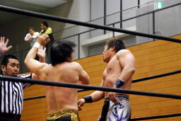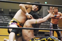 MIKAMIオルフェーヴル(左写真)、HARASHIMAがカット。佐藤がHARASHIMAを捕えてネックロックに。