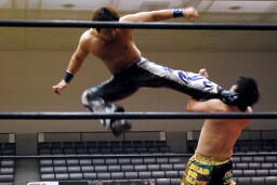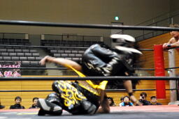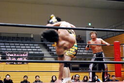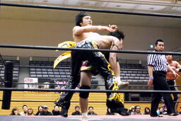 HARASHIMAロープに飛ぶ、佐藤ニールキック(右写真)、MIKAMIにタッチ。