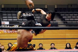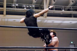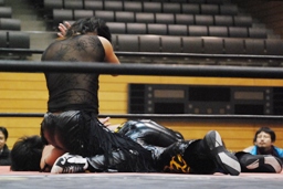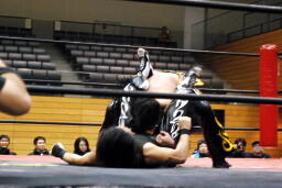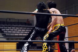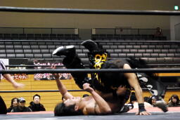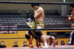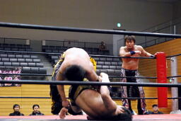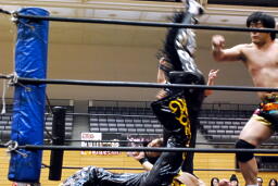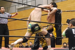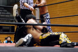 KUDO足を掛けて倒し上になるとグラウンドヘッドロック(右写真)、MIKAMIはエビ固め、カウント1。両者立ち上がる、MIKAMI腕を取る、KUDO切り返す、MIKAMIはロープを使って回転、切り返してハンマーロックに。KUDOヘッドロックからフライングメイヤー、MIKAMIヘッドシザーズでブレーク。MIKAMIロープに振る、KUDOブロックしてヒザ蹴り、ストンピング、HARASHIMAにタッチ。