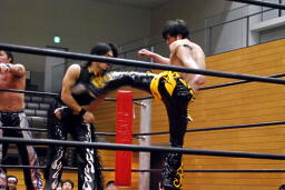 MIKAMIミサイルキック(左写真)、HARASHIMAコーナーまで吹っ飛んでKUDOにタッチ。