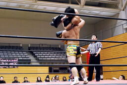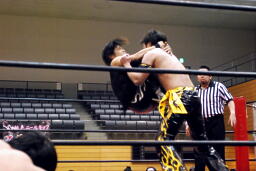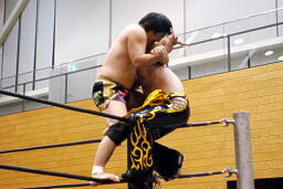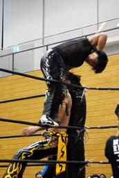 フェースカットからミッキーブーメラン180(左写真)。MIKAMI背中を向けてコーナーに上る、HARASHIMAが入り肩車バックドロップに。