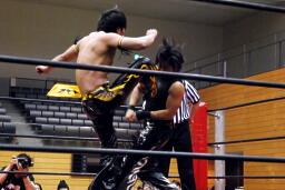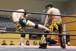 KUDOは立ち上がって延髄蹴り(右写真)。ロープに飛んでダッシュミドル、HARASHIMAにタッチ。