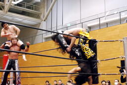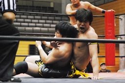 MIKAMIコーナーパンチ連打(左写真)からブロンコバスター。首投げからカバー、カウント2。MIKAMIチンロックからアームロック。リリースするとヒザ蹴り、佐藤にタッチ。