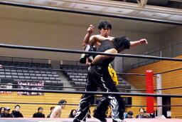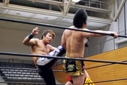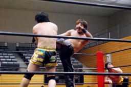 MIKAMIロープに飛ぶ、KUDOカウンターのバックスピンキック。さらにバックスピンキック2連打(右写真)、カバー、MIKAMI2で返す。KUDOMIKAMIを引き起こしてバズソーキック、カウント3。
