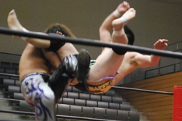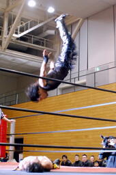 KUDOコーナーに上る、MIKAMIも追いかけて上る。KUDO回転エビの形で着地して(左写真)、