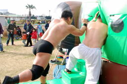 高木組が先制(左写真)、全員場外に。
