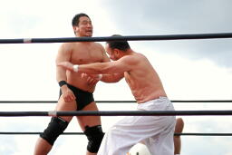 高木と越中はロックアップ、ブレークするとチョップの打ち合い(右写真)。