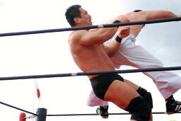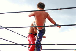 越中は暴れ足りなかったのか高木、MIKAMIにジャンピングヒップアタックのアンコール(右写真)。HARASHIMAが「鍛えているからだー!」で締めるが、久々だったせいかきれいに決まらず。