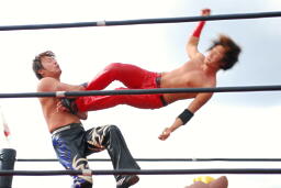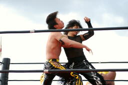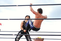 KUDOとMIKAMIリングに戻る。ロープワーク、ドロップキックは相打ちに(左写真)。高木と越中にタッチ。