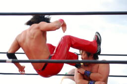 エプロンに出てスワンダイヴプレス(右写真)、カウント2。