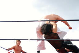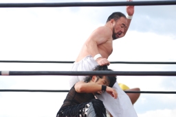 高木はHARASHIMAをロープでチョーク攻撃、反対側のロープに飛んでヒップドロップ(左写真)、カウント2。ボディスラムで投げて高尾にタッチ。