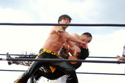 高木ドラゴンリングイン(右写真)、KUDOガットショットで迎撃。KUDOロープに振る、高木ドロップキック。