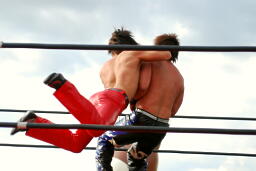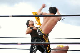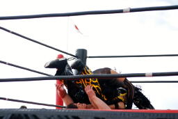 越中MIKAMIの顔面にヒップバット連打(右写真)。コーナーに詰めてナックル連打、ヒップトス。
