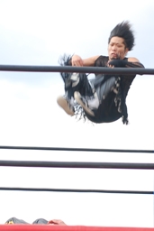 ダブルのブレーンバスターに行くが高木切り返す(右写真)。高木MIKAMIにタッチ、MIKAMIコーナーに上る。