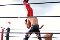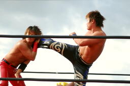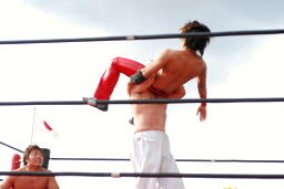 KUDOヒザ蹴り、ストンピング。コーナーに振って8×4、コーナーに上ってダイビングダブルニーアタック、MIKAMIかわす。KUDOハイキック、MIKAMIこれもかわしてす(右写真)、