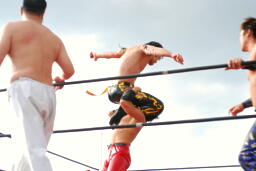 高尾串刺しエルボー、フライングエルボー(右写真)。コーナーに上ってミサイルキック、カウント2。