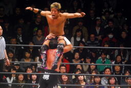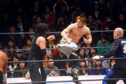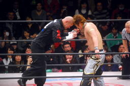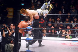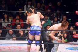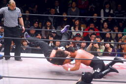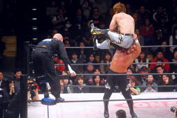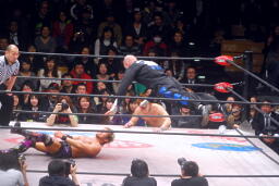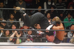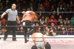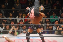新井コーナーに上ってダイビングヘッドバット(左写真)、カウント2。