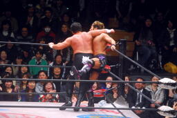 ハルクがコーナーに上がる、フジイが上がるが横須賀が引き落とす。しかしフジイはハルクをデッドリードライヴ(左写真)。