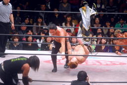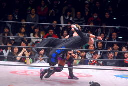 フジイコーナーに上がる、藤田が雪崩式ブレーンバスター狙ってコーナーに上るがフジイは落とす。代わりに横須賀が上がって雪崩式ブレーンバスター(右写真)。