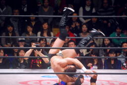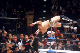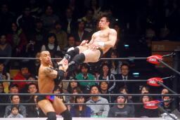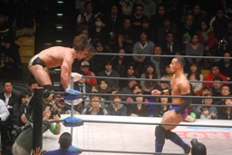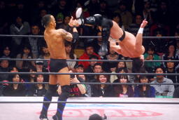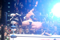 リコシェジャンピングハイキック(左写真)、カウント2。