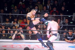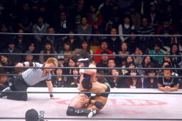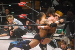 リコシェ変形のコブラツイスト(左写真)、引き倒してカウント2。
