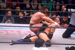 リコシェサミング、PACを背中に担ぐと十三不塔のようにぶん回して投げる(左写真)、カウント2。