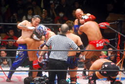 キッドがトップロープからYAMATOに飛びついて(右写真)、