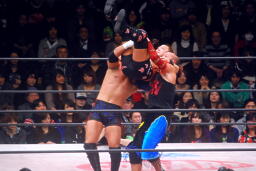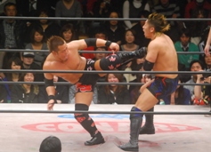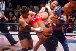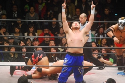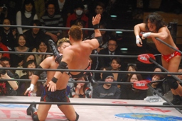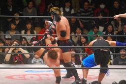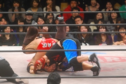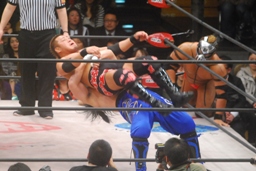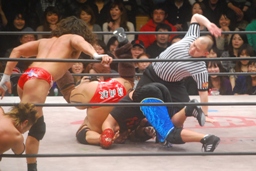 ダブルのバックドロップ(右写真)、カウントは2。ロープに固定して神田がチョップ。