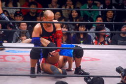 キッドダイビングフットスタンプ、ニードロップ、カウント2。神田にタッチ。神田首4の字(右写真)、そこに斎了がエルボードロップ。