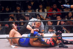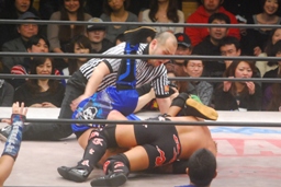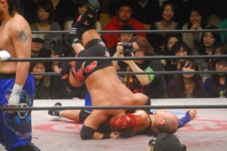 堀口逆片エビ(右写真)、リリースしてカバー、カウント2。5分経過。