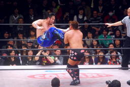 水面蹴りで体勢を崩しシャイニング・ウィザード(右写真)。