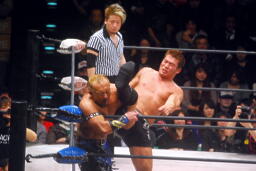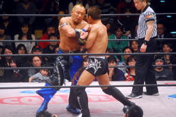 しかしセコンドの介入で玉岡レフェリーがダウンしたスキにBW勢が入って攻撃(左写真)、しかしフジイがこれを阻止。