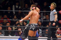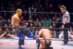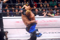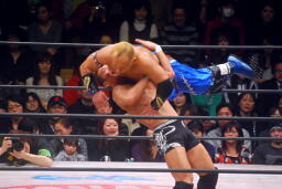望月バックドロップに切り返す、Gamma体を浴びせて押しつぶす(左写真)、カウント2。